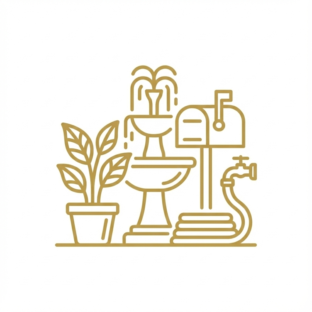 The finishing touches including drainage systems, fountains, AEG pipes, clotheslines, letterboxes, and garden lighting installation.